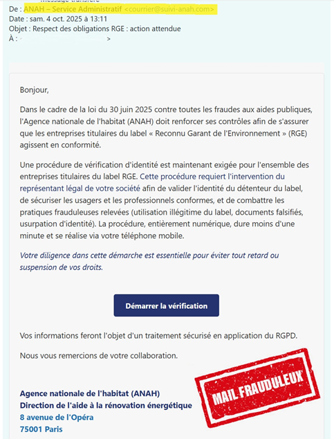 L’ANAH a immédiatement saisi les autorités compétentes. Nous invitons chacun à redoubler de vigilance et à ne jamais transmettre d’informations personnelles ou bancaires en réponse à ce type de message.